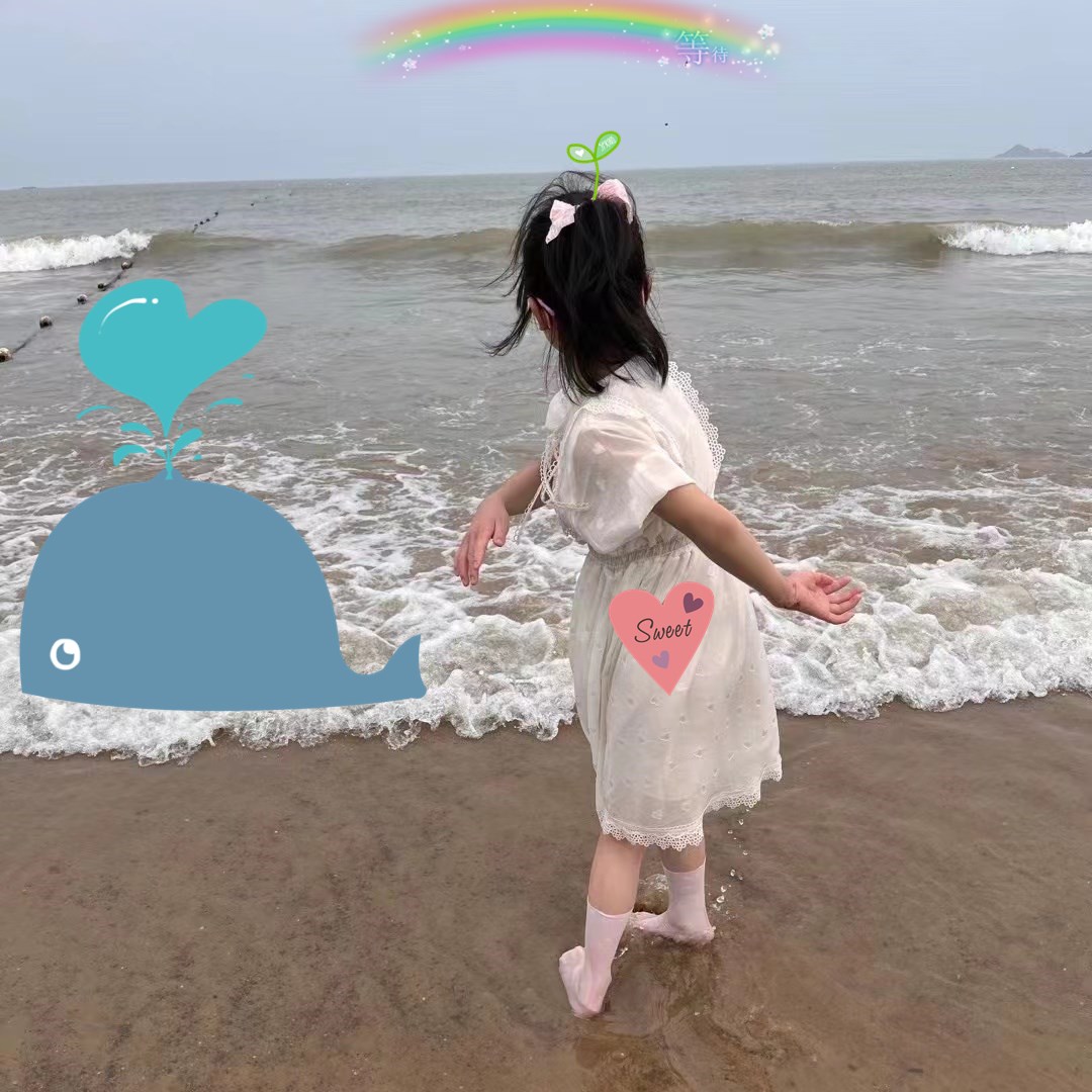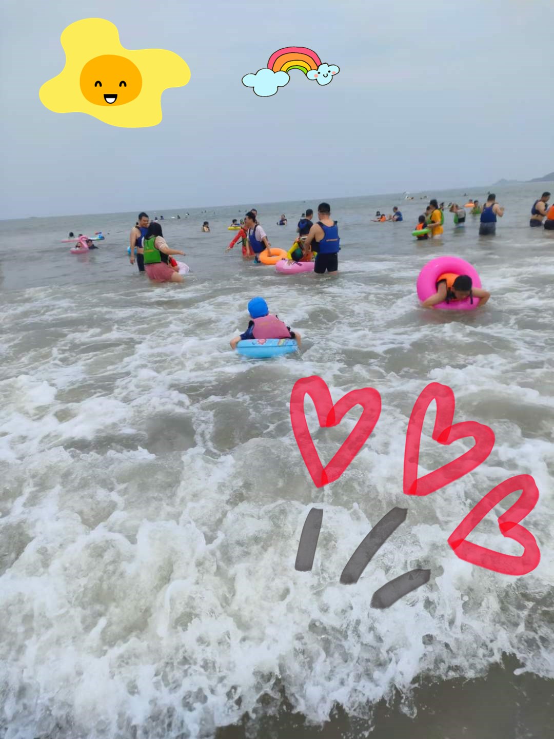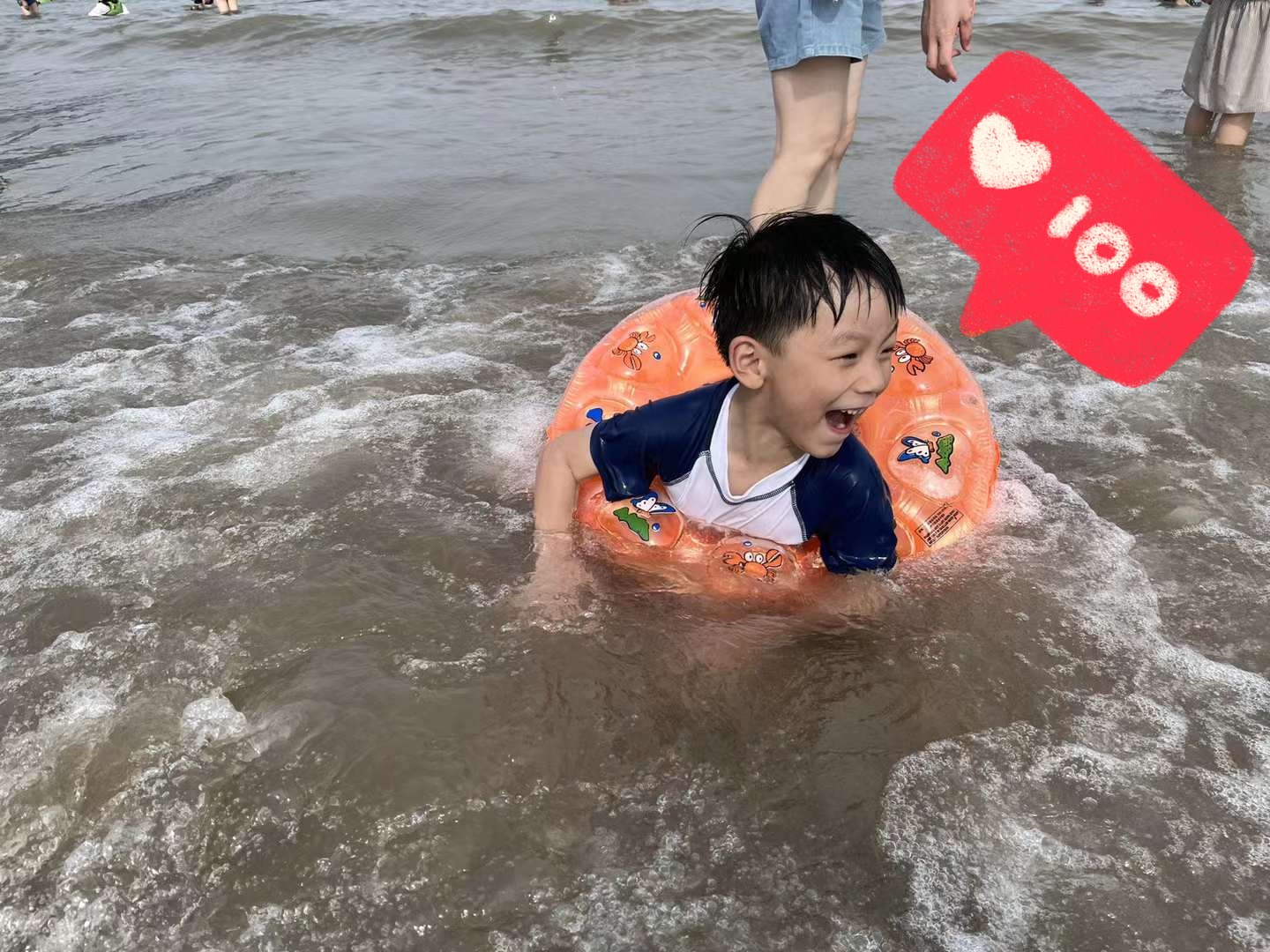 小朋友們宛如一只只活潑可愛的小鴨子自由自在地游來游去。孩子們的喊聲,笑聲,打鬧聲充斥著整個(gè)海灘,蕩漾著歡樂。